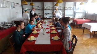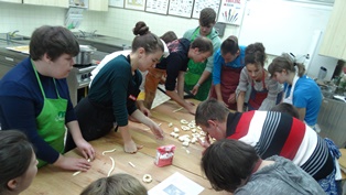 Tudi naša šola se je pridružila pobudi Varstveno delovnega centra iz Novega mesta. Učenci iz Osnovne šole s prilagojenim programom Mirna so skupaj z našimi dijaki pripravili idrijske žlikrofe, iz kvašenega testa so pripravili perece in pečena jabolka z orehi. Na koncu so učenci s pomočjo naših dijakov pripravili mizo in se naučili različne tehnike zlaganja prtičkov.