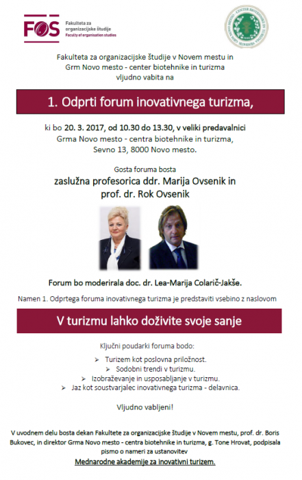V ponedeljek, 20. 3. 2017 Fakulteta za organizacijske študije v Novem mestu in Grm Novo mesto – center biotehnike in turizma organizirata 1. ODPRTI FORUM INOVATIVNEGA TURIZMA.